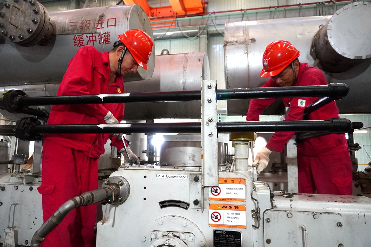 此次檢修的BOG壓縮機屬于往復(fù)式壓縮機,其氣閥、支撐環(huán)、填料環(huán)、填料函等屬于摩擦易損件,需定期檢查維修,避免設(shè)備發(fā)生故障,影響到整個裝置正常生產(chǎn)。氣閥檢修是此次壓縮機檢修的重點,氣閥能否正常工作直接影響壓縮機的工作效率,因此檢修人員要對各級氣閥密封性進(jìn)行細(xì)致、全面檢查,并對閥內(nèi)磨損件進(jìn)行修復(fù)更換。高溫籠罩的廠房如同一個蒸籠,機器的轟鳴聲讓原本悶熱的車間更增添了幾分躁熱,面對高溫和疲憊的雙重挑戰(zhàn),檢修人員不服“暑”,或蹲下、或彎腰、或趴著,即使臉上流淌著汗水,工作服也被汗水打濕,他們手里的活一刻也沒有停下;他們緊盯作業(yè)過程,不放過一絲隱患;嚴(yán)格把控檢修質(zhì)量,不放過一點瑕疵,用實際行動奮力答好檢修“烤”卷。