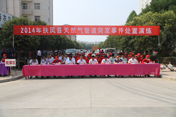 省安監(jiān)局應急辦主任郭力,扶風縣委常委、縣政府常務副縣長張揚,扶風縣委常委、政法委書記景行軍,扶風縣政府副縣長鄭建安,集團公司安監(jiān)處副處長李軍,股份公司副總經(jīng)理、城燃公司執(zhí)行董事尚長印,股份公司總工程師李平利,城燃公司總經(jīng)理李冬學等領導出席了本次演練,股份公司安監(jiān)部、燃氣事業(yè)部、扶風縣住建、安監(jiān)、公安、消防等25個相關部門以及燃氣行業(yè)專家也參加了此次活動。